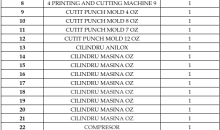 Pachet bunuri mobile – echipamente folosite pentru prelucrare hârtie, compus din: Paper Cup Machine, Printing and Cutting Machine, Cutit Punch Mold, Cilindru Anilox, Cilindru Maşină OZ, Compresor, Mese de colectare, Masă schimbare Cilindri Aparat igienizare, Masă testare şi Scară, conform anexa.