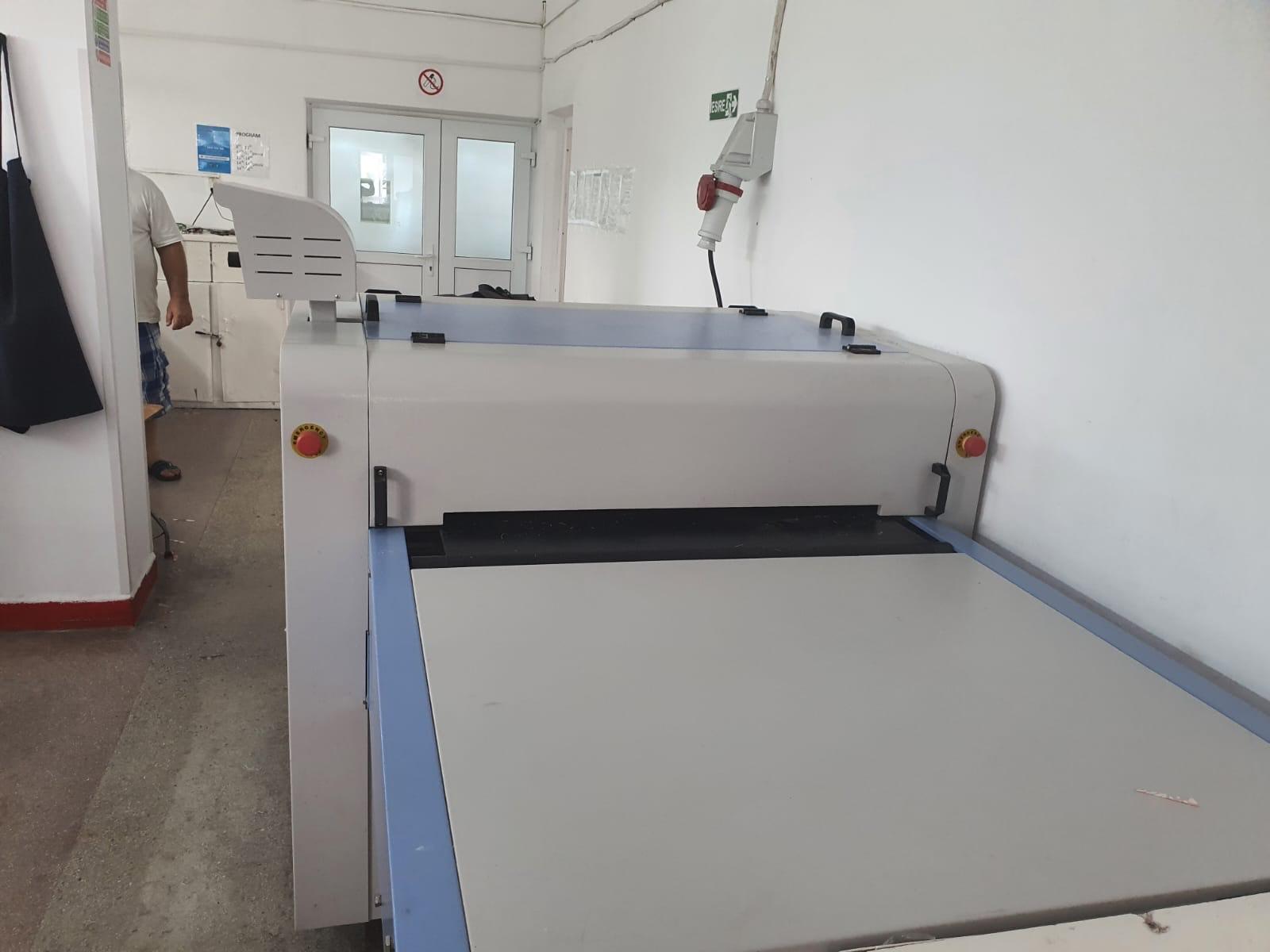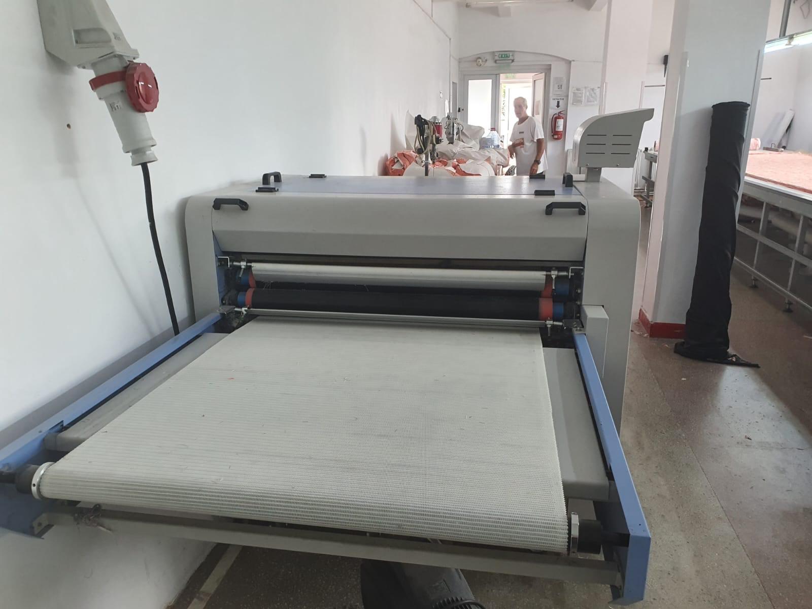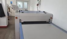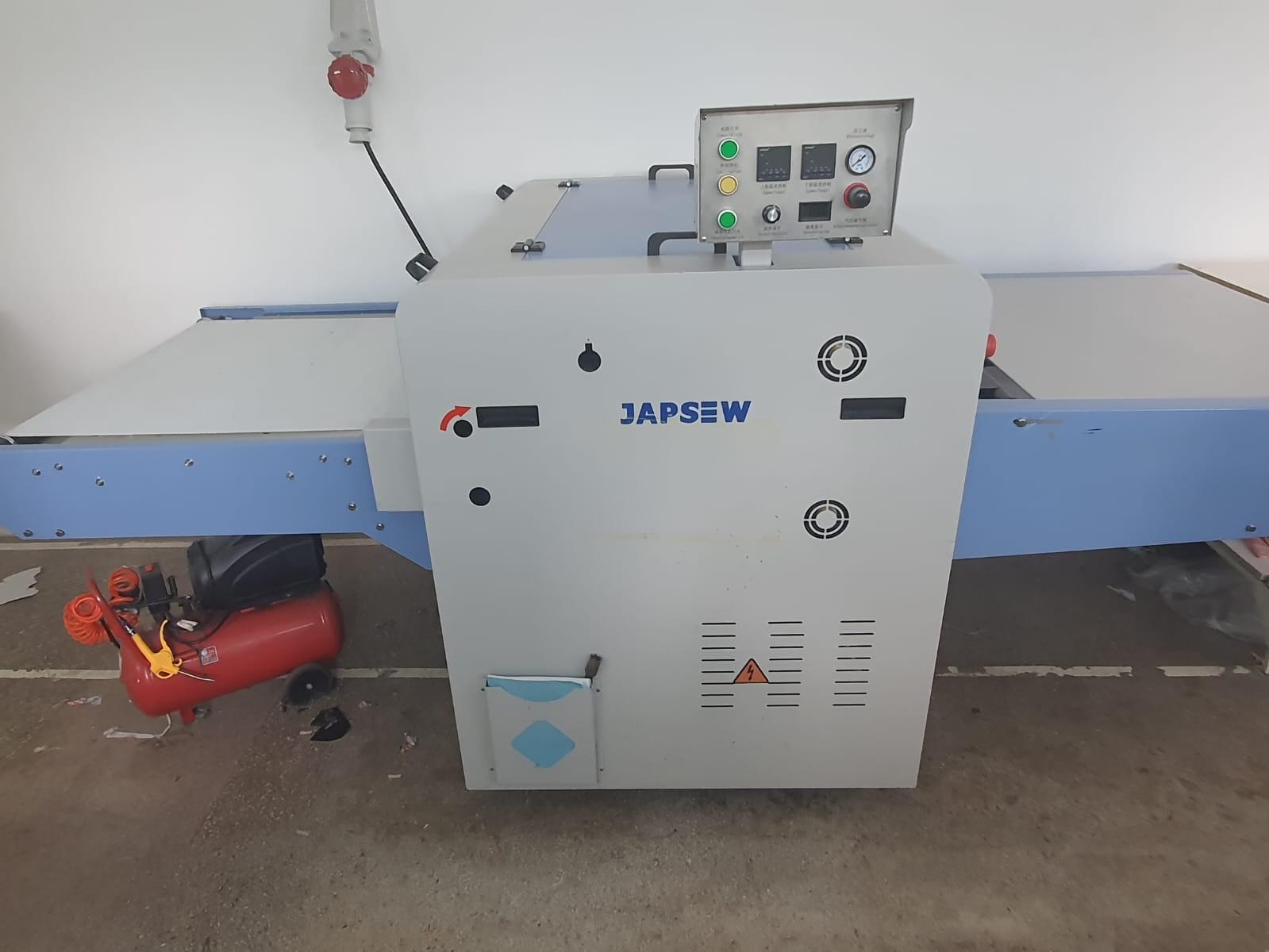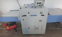 Presă de termocolat, marca Japsew, model SR-900- Reliant pentru termocolat, banda continuă de 900 mm, an fabricaţie 2019, lăţime benzi: 900 mm, temperatura reglabilă max. 220 C, forța de presare reglabilă 3 kg/cmp, viteză benzi 0-10 m/min, putere rezistenţă 12 kW, putere motor 0,3 kW, dimensiuni 295x150x120 cm, greutate: 420 Kg, necesită aer comprimat: 0,3 MPA,